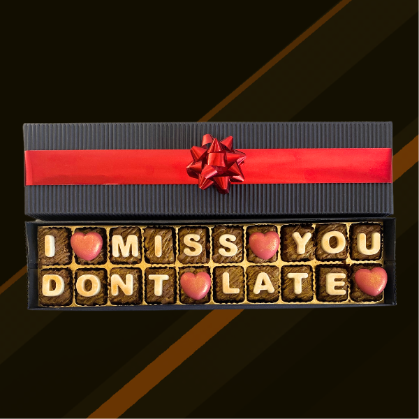 Caja de 20 minibrownies personalizados con el mensaje โI miss you donโt lateโ
