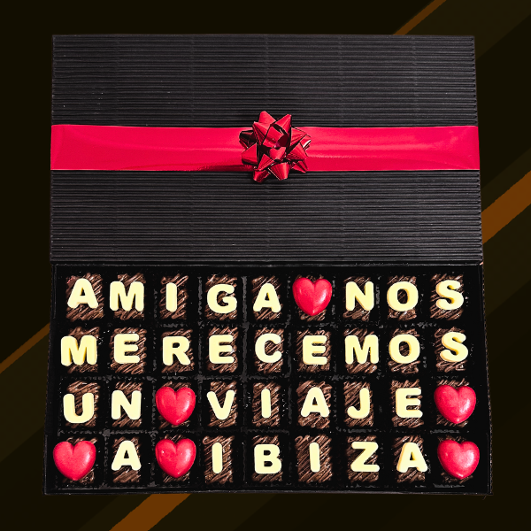 Caja de 36 brownies personalizados con el mensaje โAmiga, nos merecemos un viaje a Ibizaโ ๐ซ๐