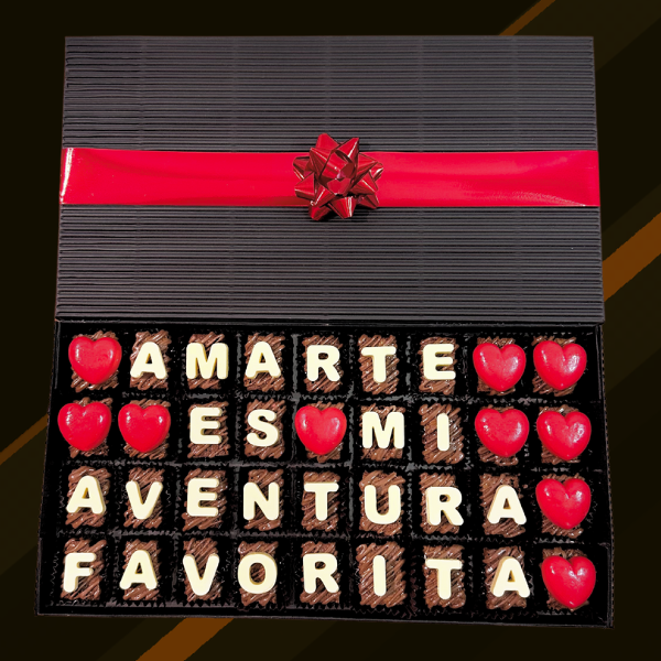 Caja de 36 brownies personalizados con el mensaje «Amarte es mi aventura favorita» 🍫🎉